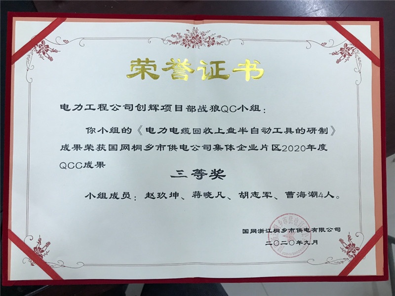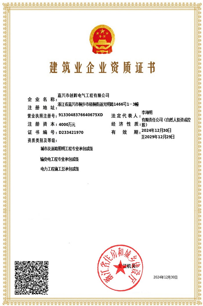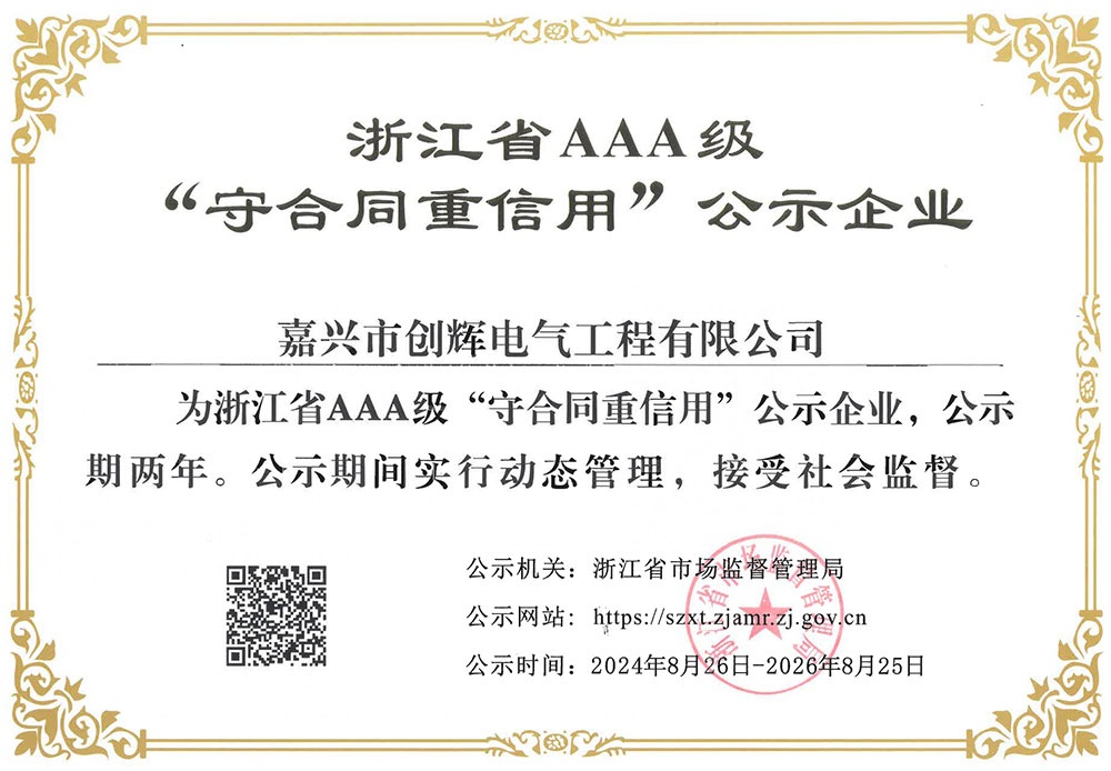 At present, our company has the power engineering general contracting grade II, power transmission and transformation engineering professional contracting grade II qualification, city and road lighting engineering professional contracting grade II qualification, installation (repair, test) power facilities license grade II qualification, building construction safety production license, is a high-tech enterprises in Zhejiang Province, the province of AAA grade “abide by the contract and trustworthy” enterprise.