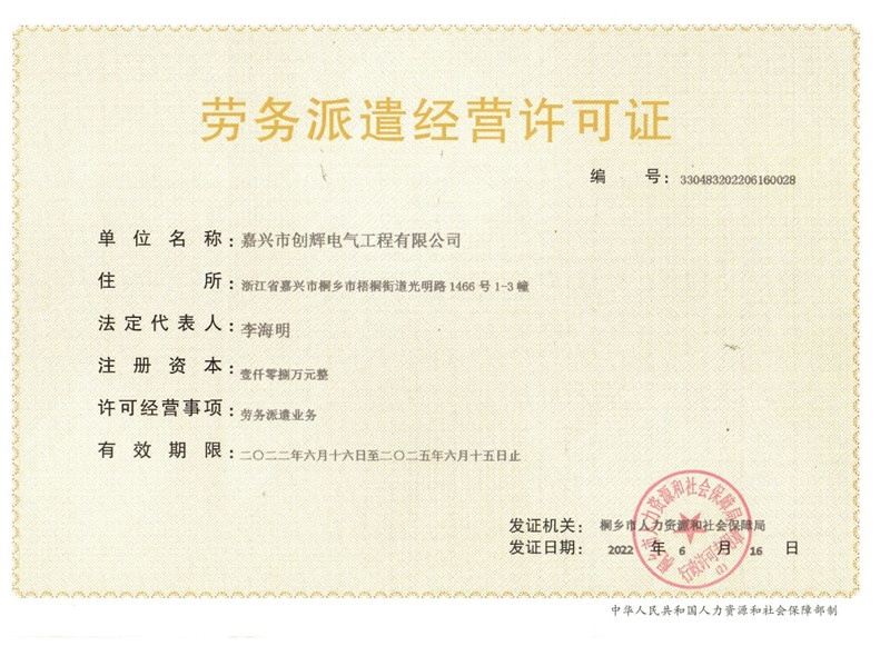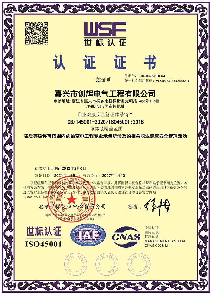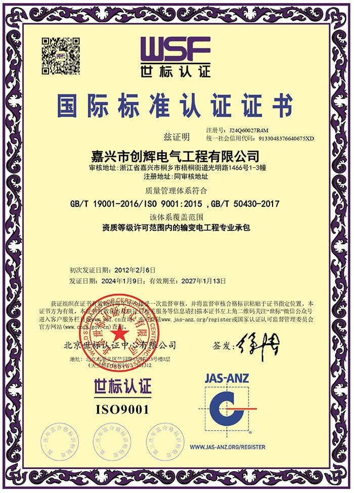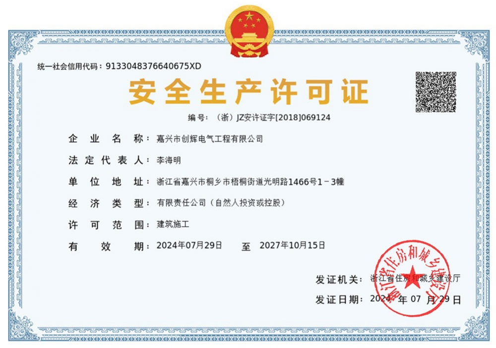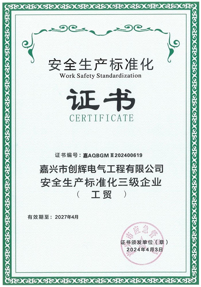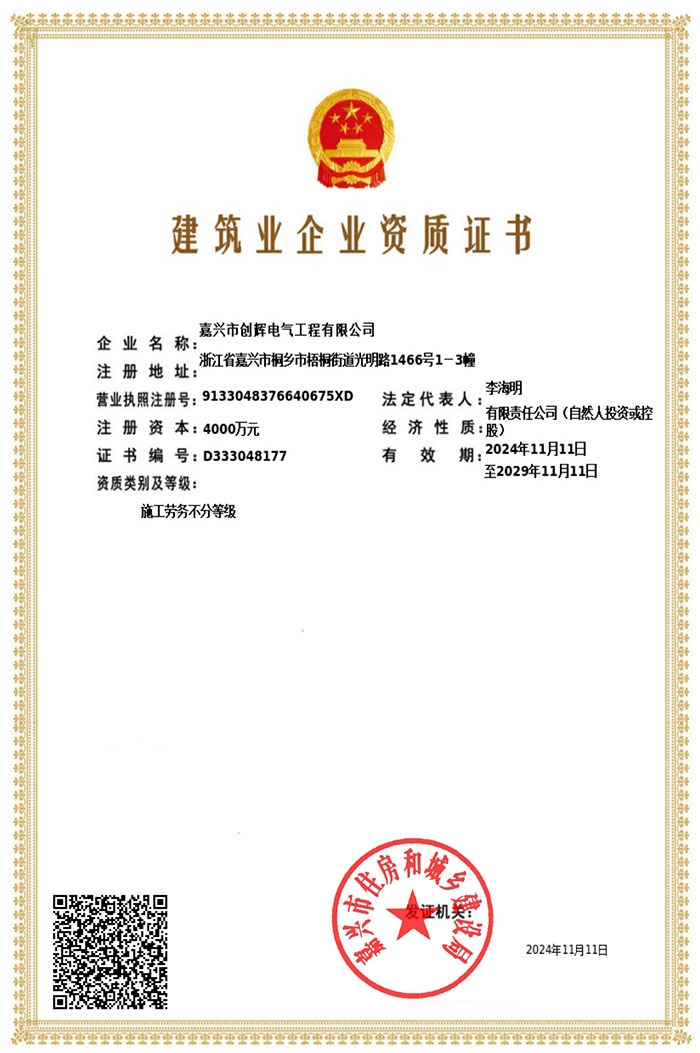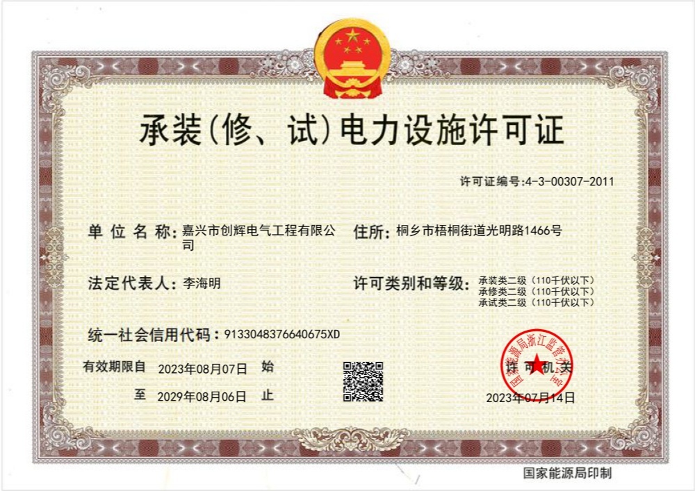 Jiaxing Chuanghui Electric Engineering Co., Ltd, headquartered in Tongxiang Economic Development Zone, Zhejiang Province, the company was founded in 2004, is a high and low-voltage power transmission and transformation project construction and installation, maintenance of enterprises. The company consists of Personnel and Administration Department, Preliminary Settlement Department, Procurement Department, Finance Department, Marketing Department and Engineering Department, etc., of which the Engineering Department is divided according to the specific content of the operation: Substation Project Department (12 teams), Line Project Department (6 teams). There are more than 500 employees, including 3 first-class constructors, 15 second-class constructors, 1 senior engineer, 36 engineers, 52 assistant engineers, and more than 240 high-voltage electricians. At present, our company has already possessed the qualification of Grade II General Contractor of Electric Power Engineering, Grade II Professional Contractor of Power Transmission and Transformation Engineering, Grade II Professional Contractor of City and Road Lighting Engineering, Grade III License for Installing (Repairing and Testing) Electric Power Facilities, and Safety Production License for Building Construction, and it is the High-tech Enterprise of Zhejiang Province, and the provincial AAA Grade “Contract Abiding and Credit Repaying” Enterprise. It is a high-tech enterprise in Zhejiang Province and AAA grade “contract-keeping and credit-keeping” enterprise.